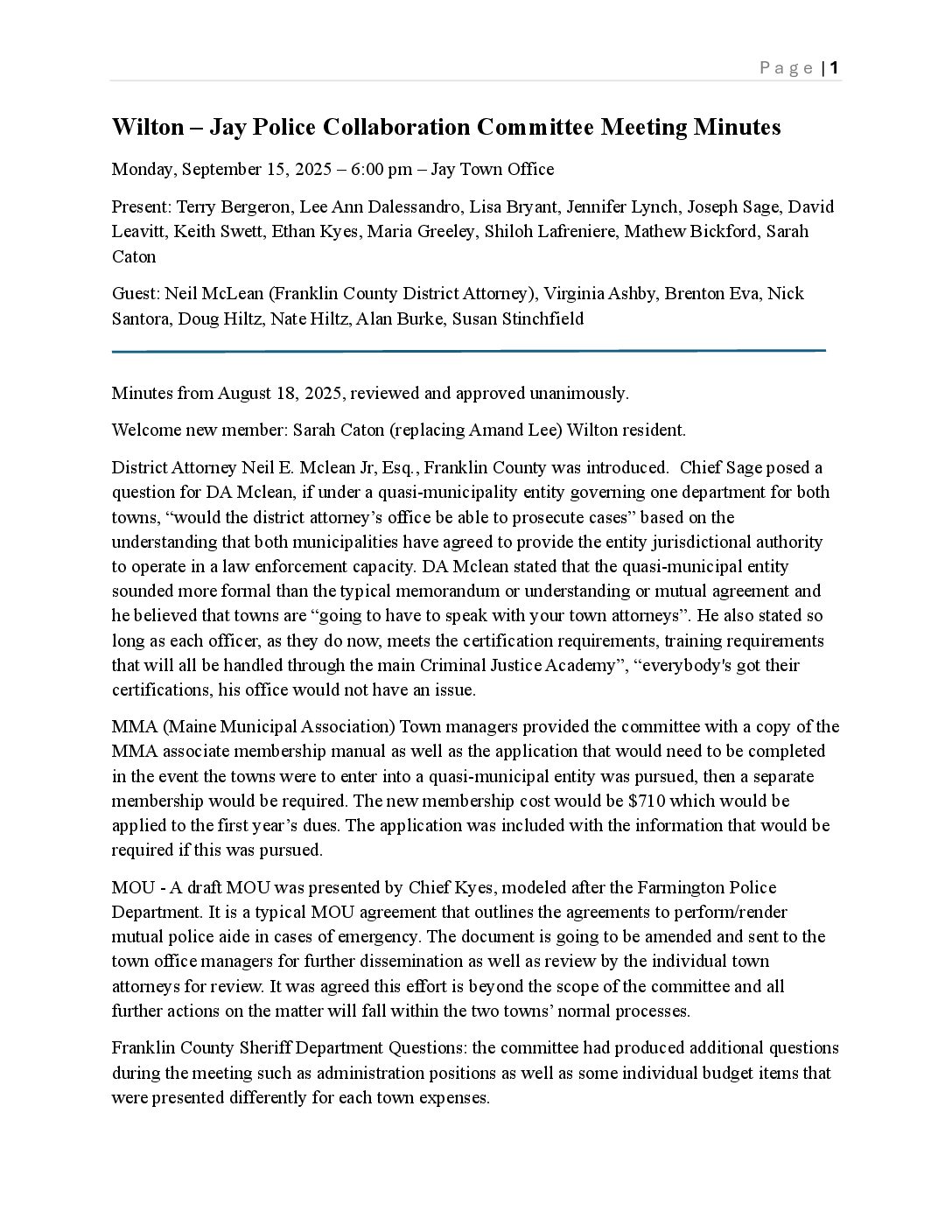 Wilton – Jay Police Collaboration Committee Minutes – September 15th, 2025