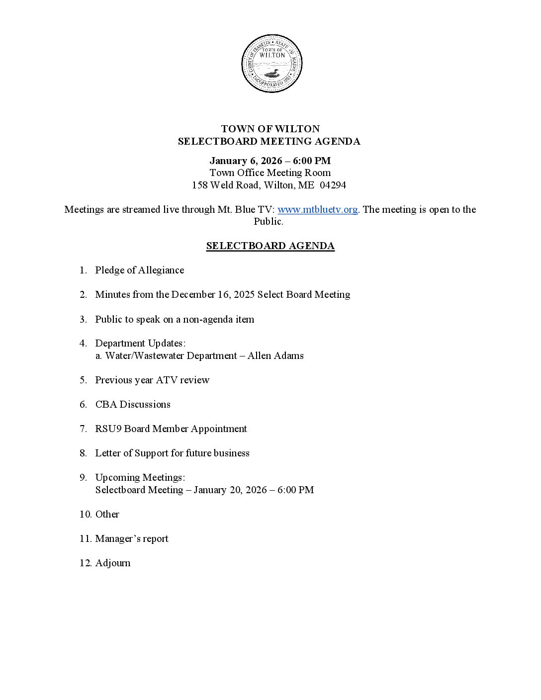 Selectboard Agenda January 6th, 2026