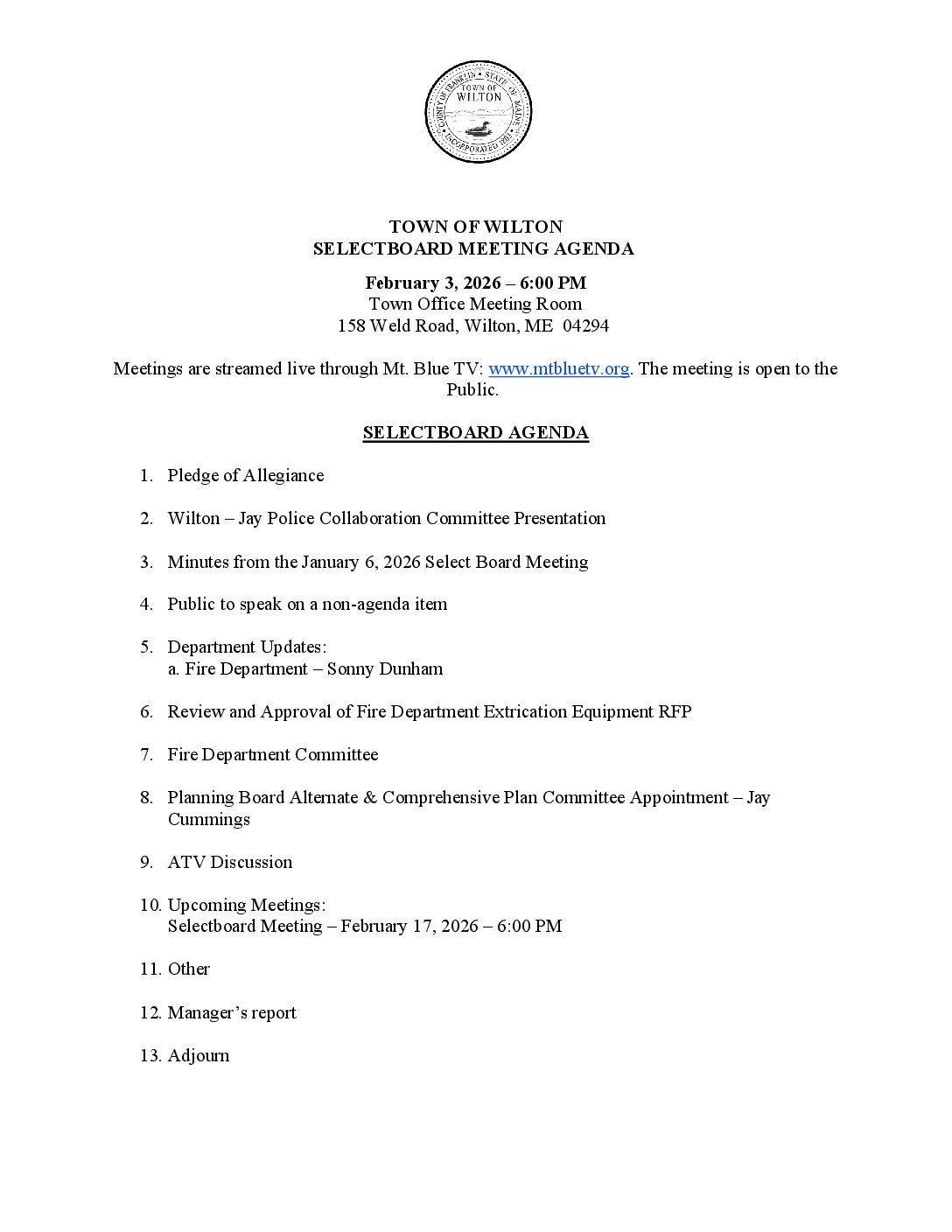 Selectboard Agenda February 3rd, 2026