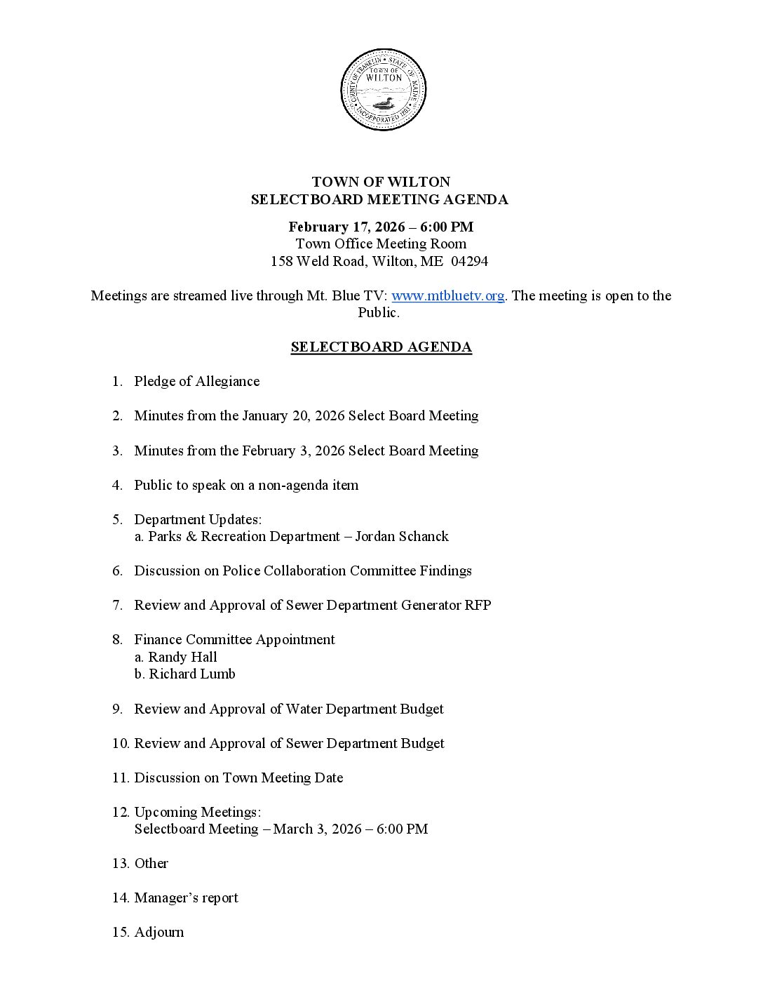 Selectboard Agenda February 17th, 2026