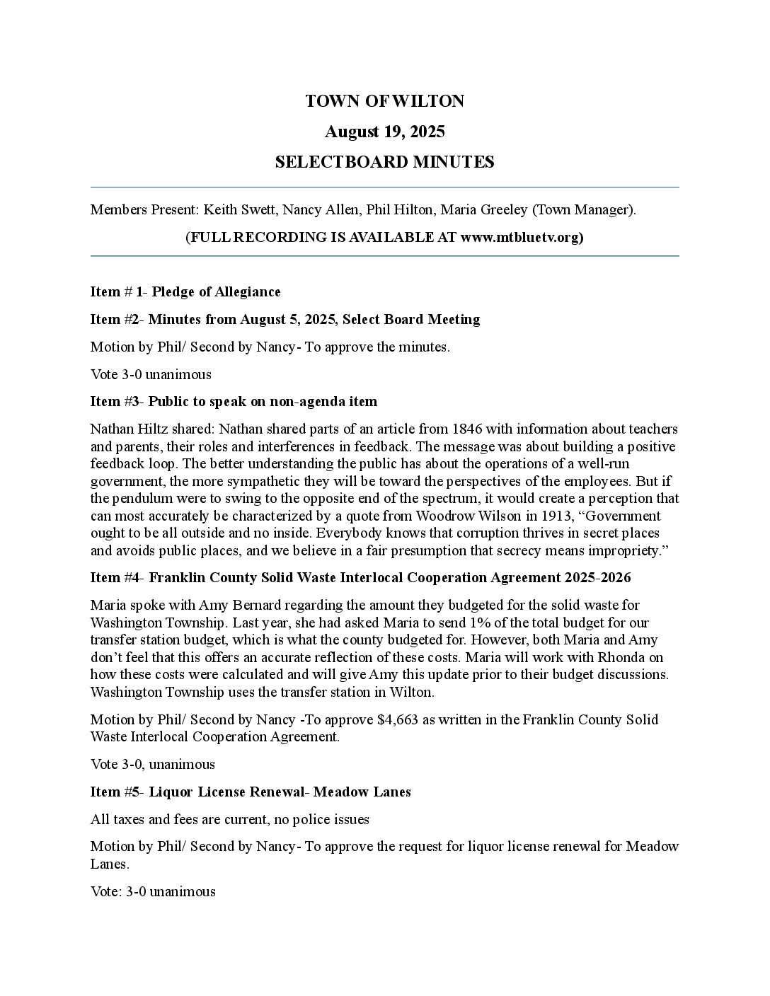 Selectboard Minutes 08-19-2025