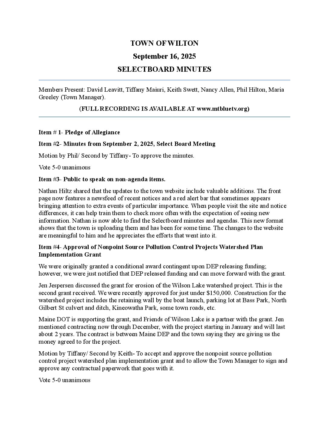 Selectboard Minutes 09-16-2025