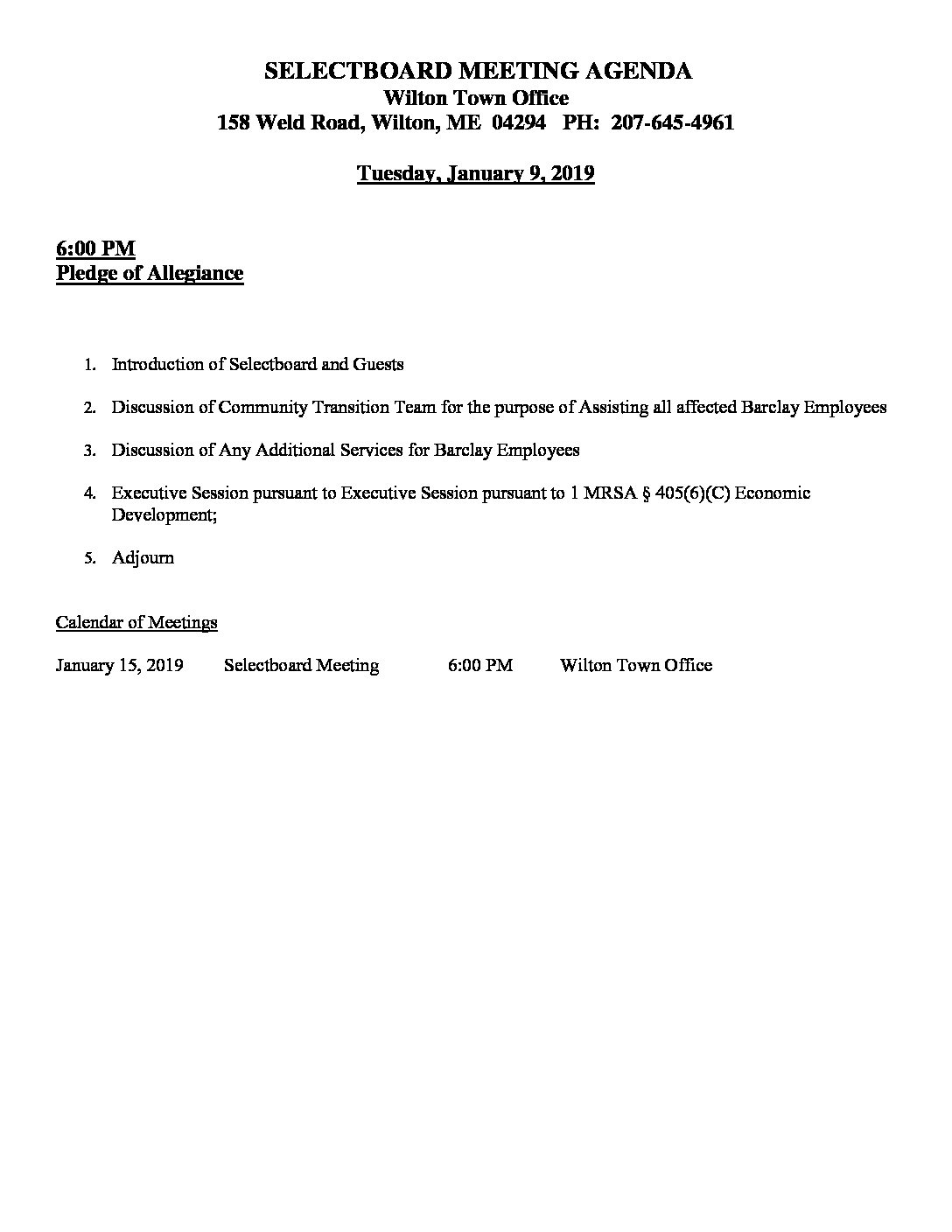 Selectperson’s Meeting Agendas 01-09-19