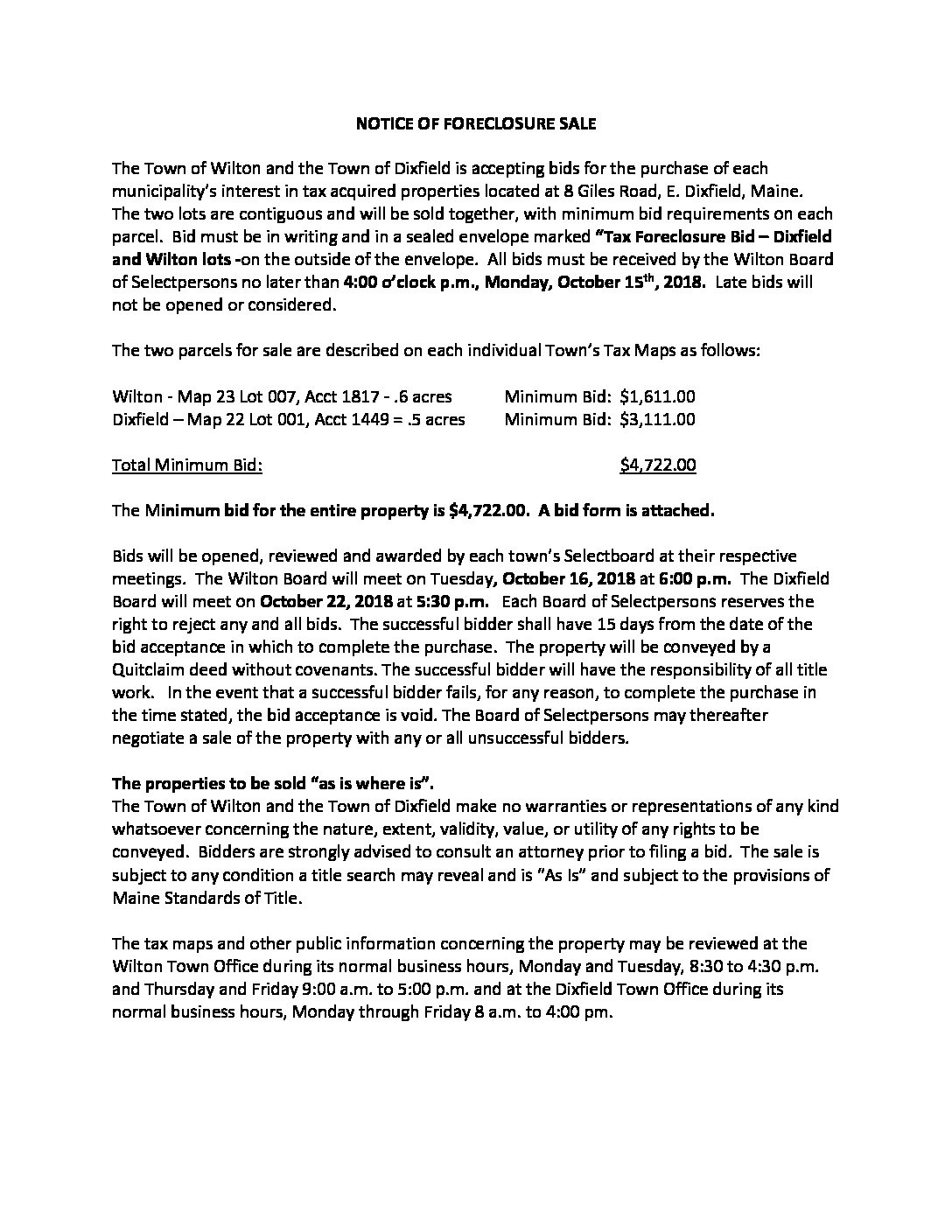 Tax Foreclosure Bid September 2018