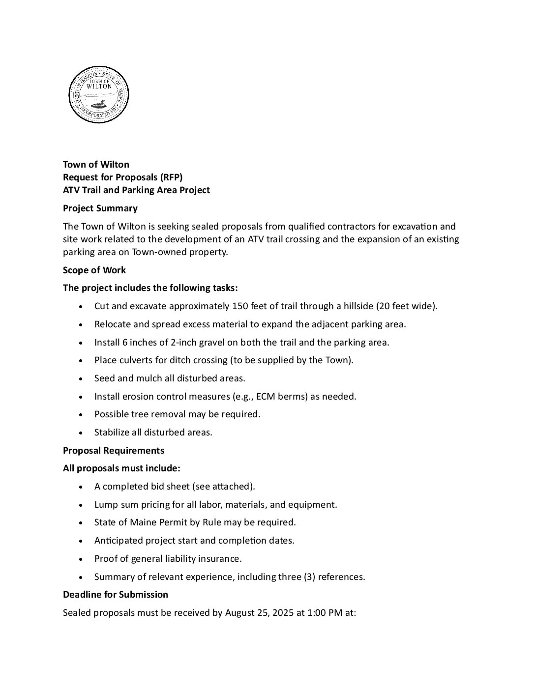 Wilton – 2025 Administration – ATV Parking Lot Maintenance – Due August 25, 2025