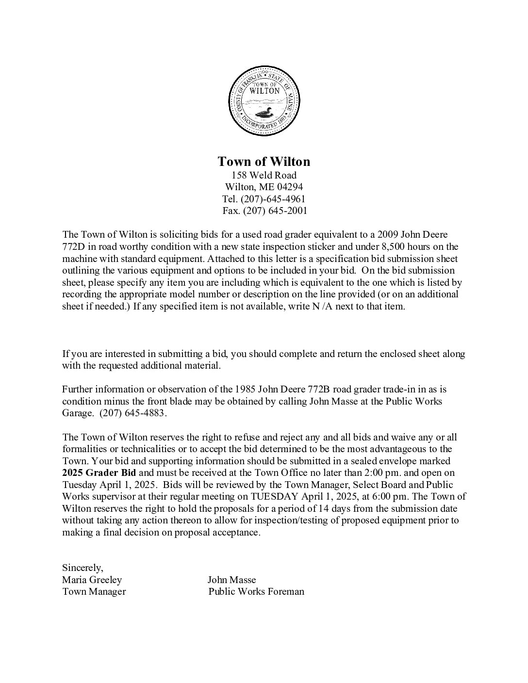 Wilton – 2025 – Public Works Grader – Due April 1, 2025