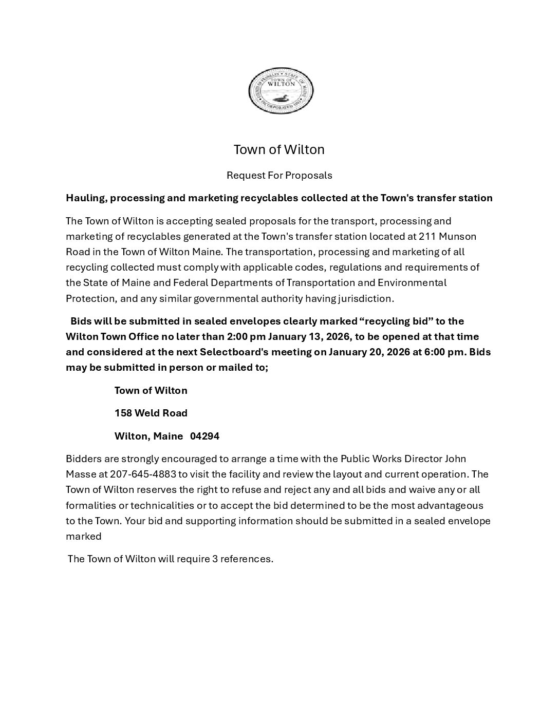 Wilton – 2025 – Public Works Recycling RFP – Due January 13, 2026