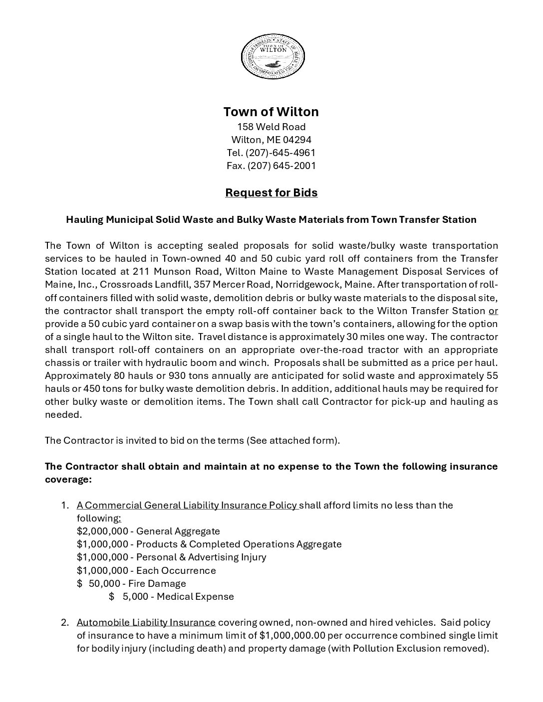 Wilton – 2025 – Public Works Solid Waste Hauling RFP – Due January 13, 2026