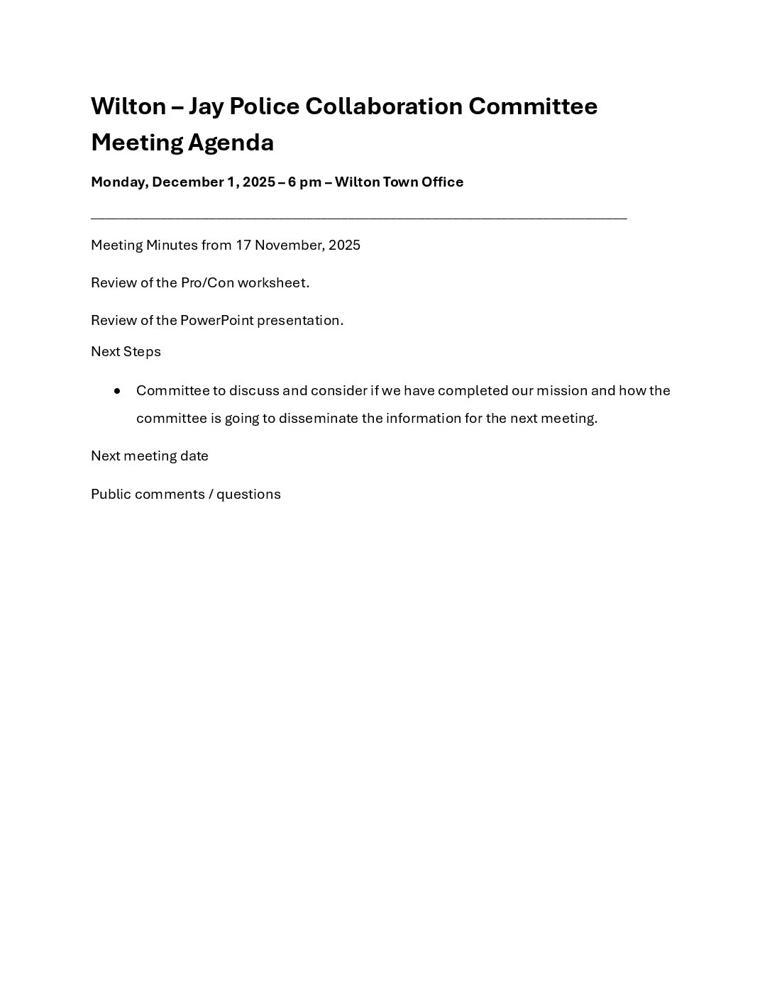 Wilton – Jay Police Collaboration Committee Agenda – December 1st, 2025
