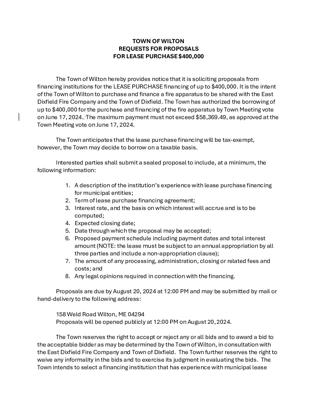 Wilton – RFP East Dixfield Mini Pumper – Lease Purchase – Due August 20, 2024