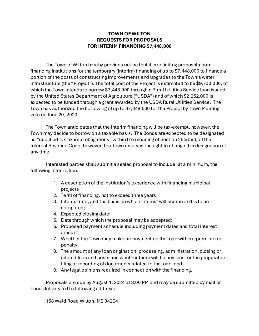 Wilton – RFP Interim Financing – USDA Water Project+ – Due August 1, 2024
