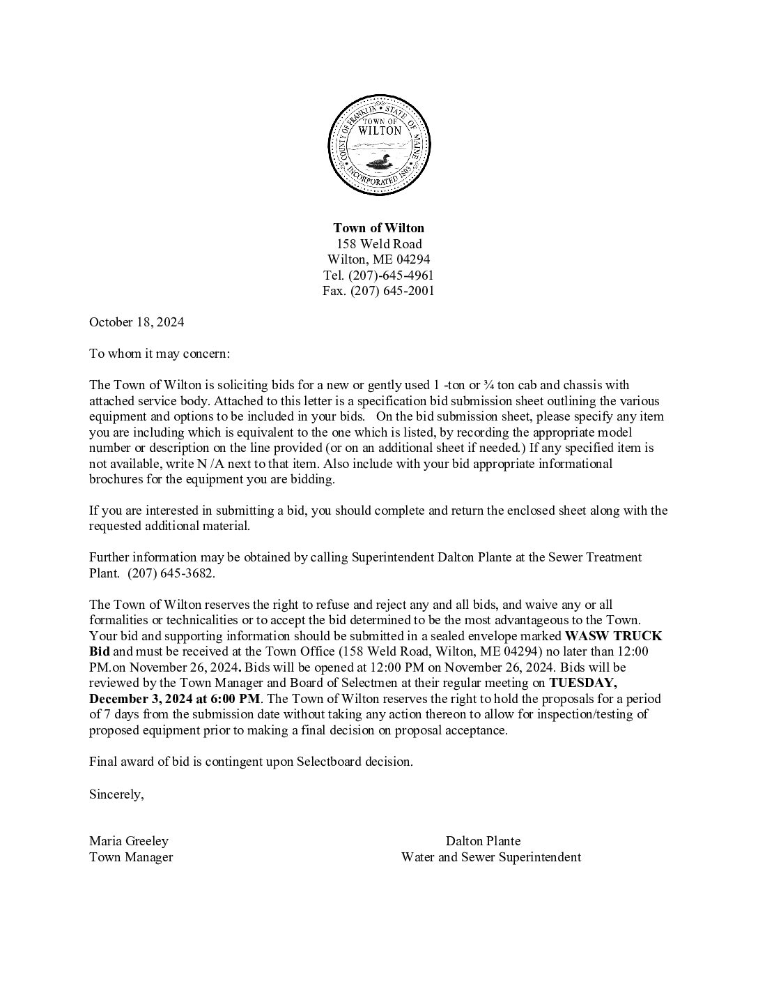 Wilton – RFP WASW Truck Bid – Due November 26, 2024